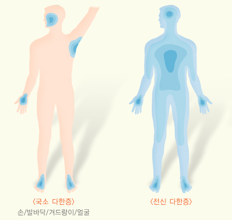 다한증은 땀이 나는 부위에 따라 국소 다한증과 전신 다한증으로 나뉩니다. 국소 다한증은 손이나 발바닥 겨드랑이 얼굴과 같은 특정 부위에 과도하게 땀이 발생되는 것을 말합니다. 뚜렷한 원인 없이 발생되는 경우가 많습니다. 전신다한증은 전신적으로 많은 땀이 발생하는 것으로 기저질환이 동반되는 경우가 많습니다.