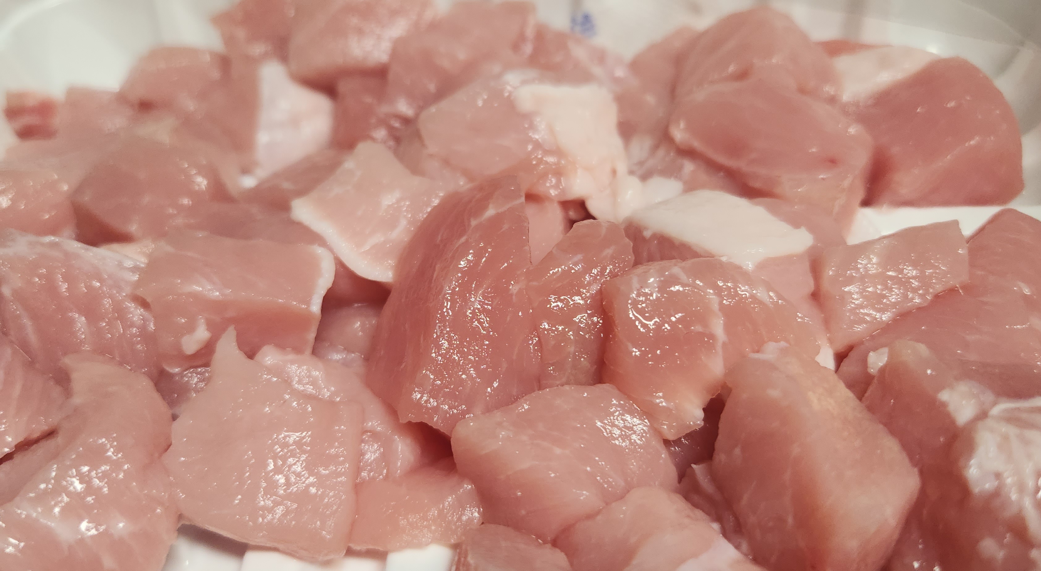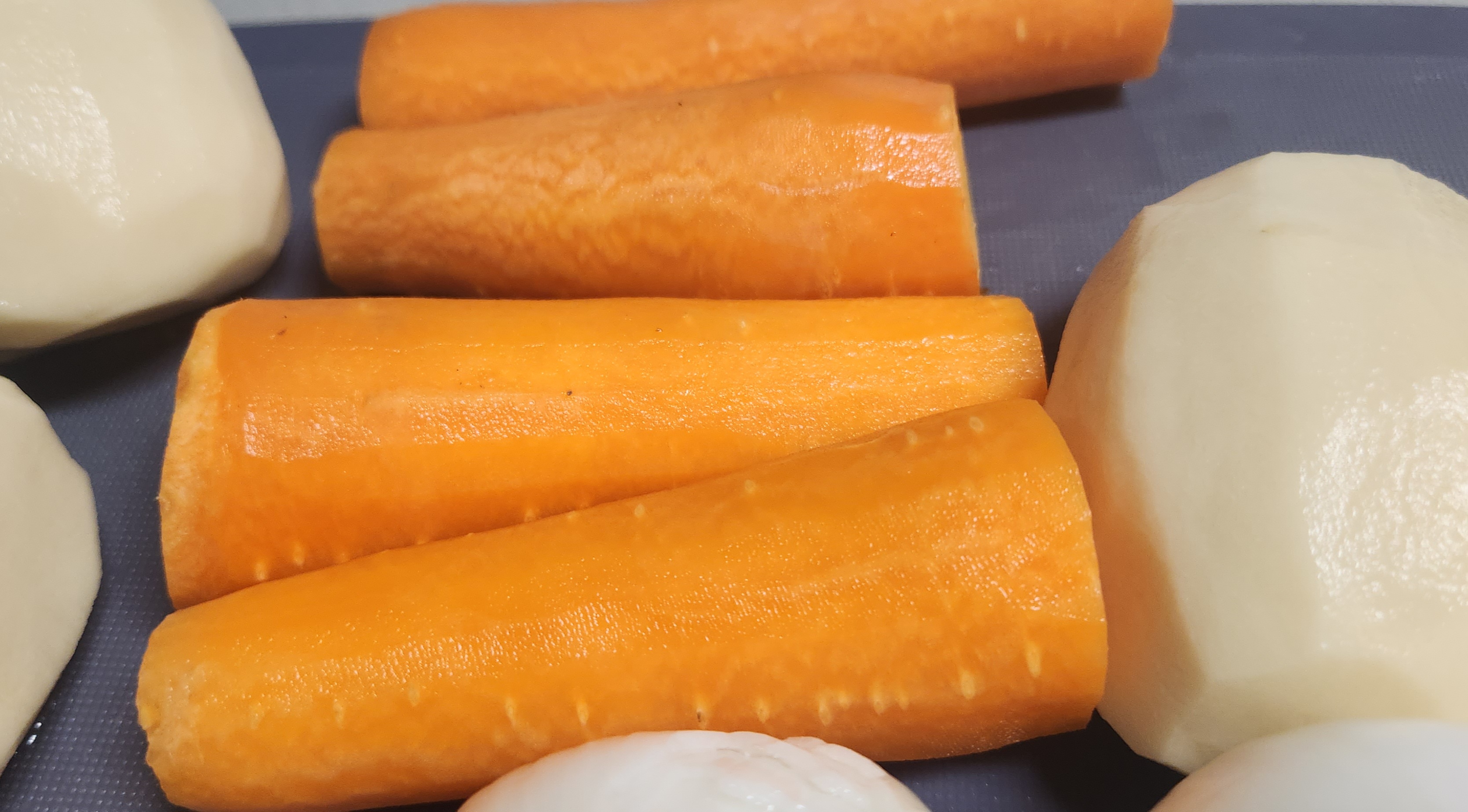감자, 당근, 양파, 고기(오늘은 돼지고기, 다른 고기도 가능 소고기 닭고기)를 먹기 좋은 크기로 자릅니다. 마트에서 사 온 카레도 준비합니다 (오늘은 오뚜기 백세카레)