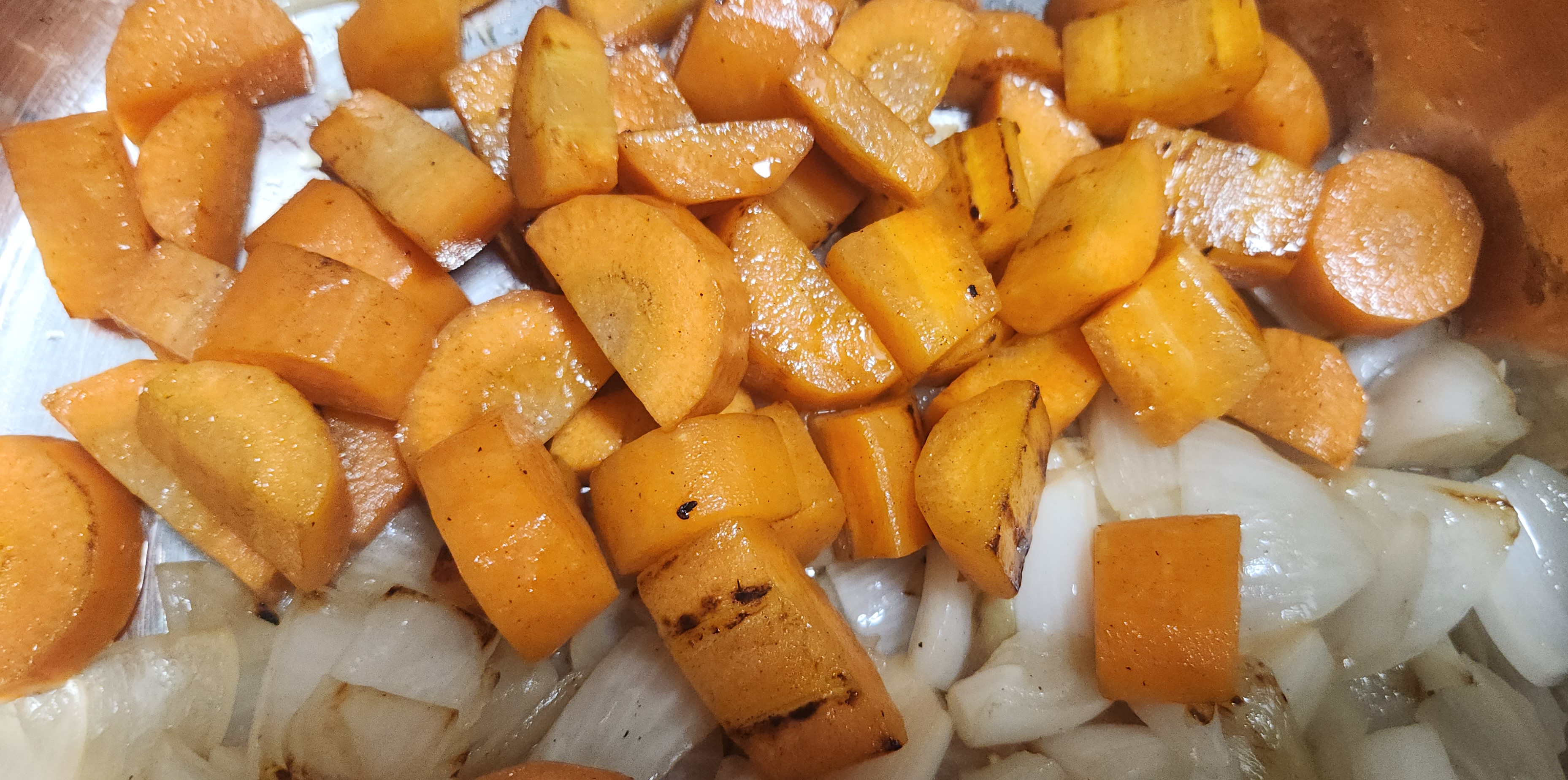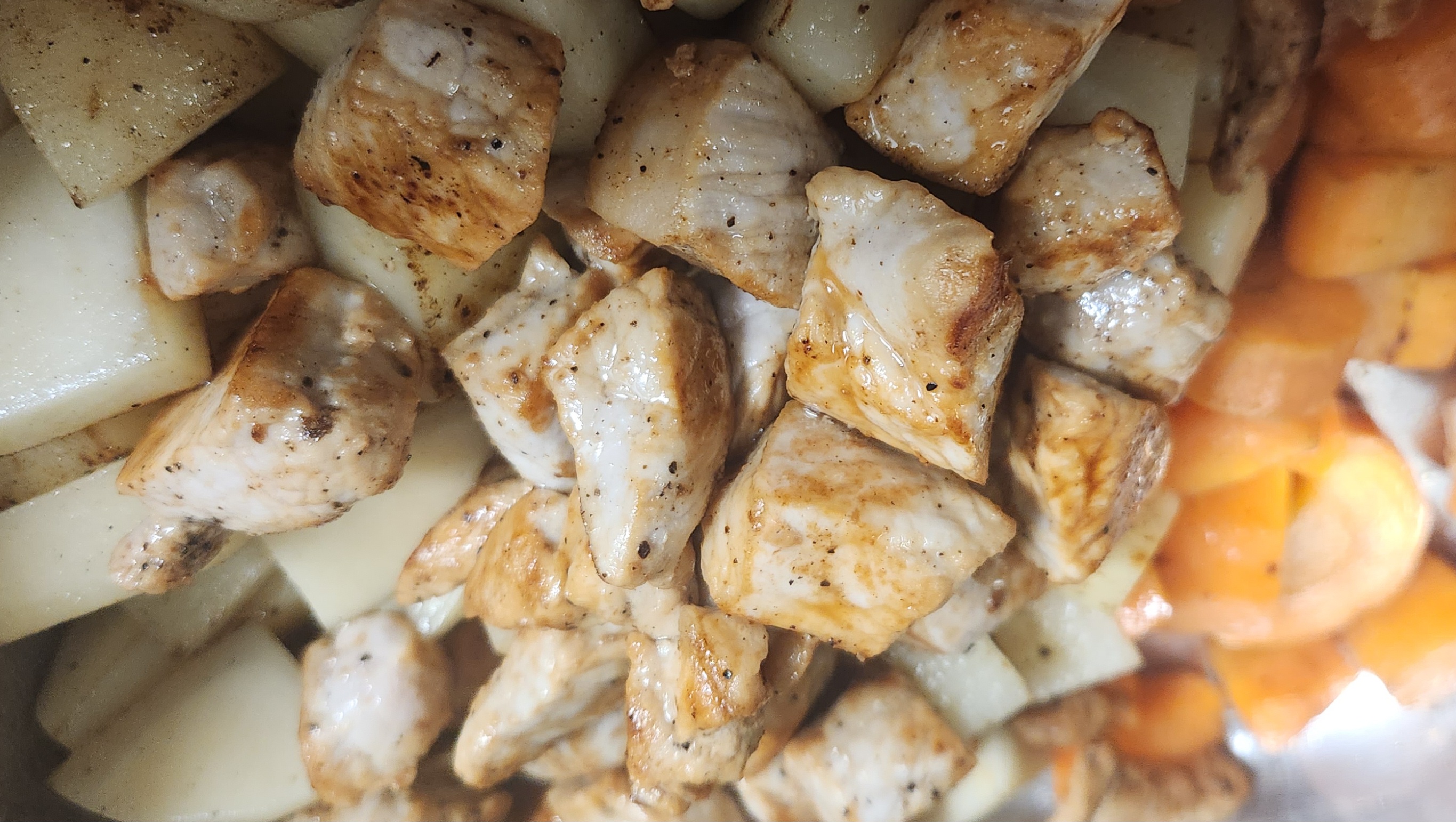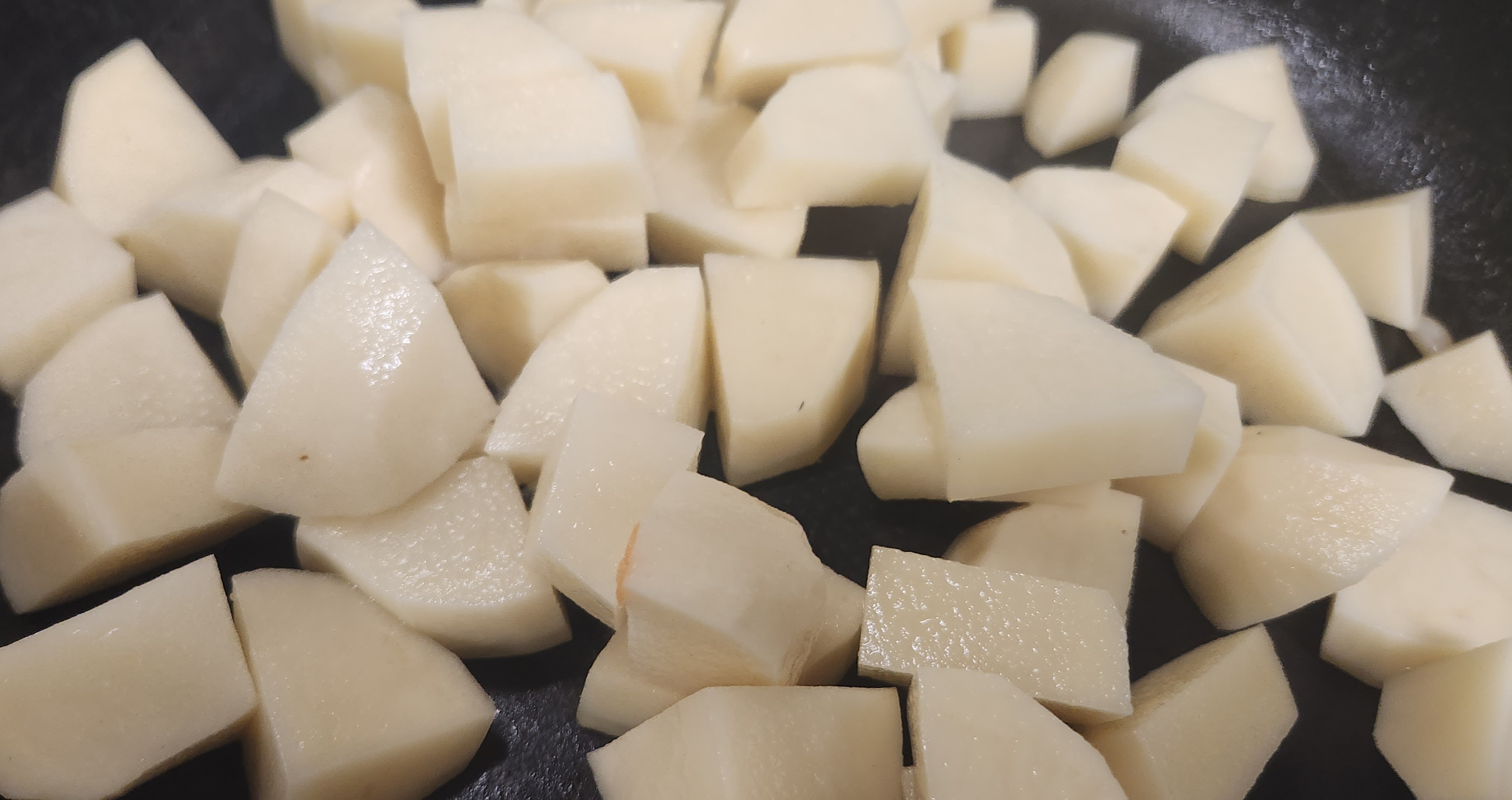 프라이팬에 식용유를 두르고 양파를 먼저 볶다가 고기 감자 당근 순서로 넣어 볶아줍니다. 고기는 소금과 후추로 간을 좀 해주었습니다. 재료 겉면이 익을 때까지 볶아줍니다. 재료준비 끝