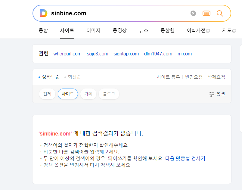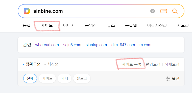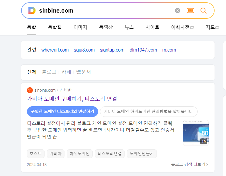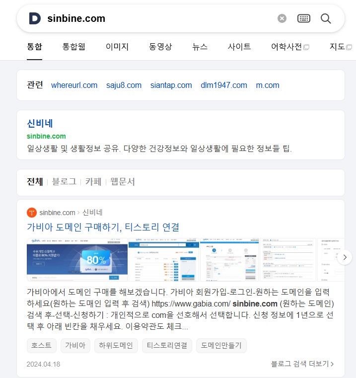 다음에서 제 사이트 sinbine.com 을 검색했을때 사이트는 나오지 않고 글 1개만 뜨고 있습니다. 최적화가 되지 않았을 경우 사이트에 검색 결과가 없다고 뜨게 됩니다. 도메인을 중간에 바꿔서 그런건지 이유는 정확히 알수가 없네요.