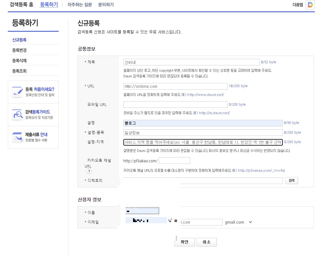 신규등록하기 내용이 나오면 *표시가 있는곳을 채워주시면 됩니다.