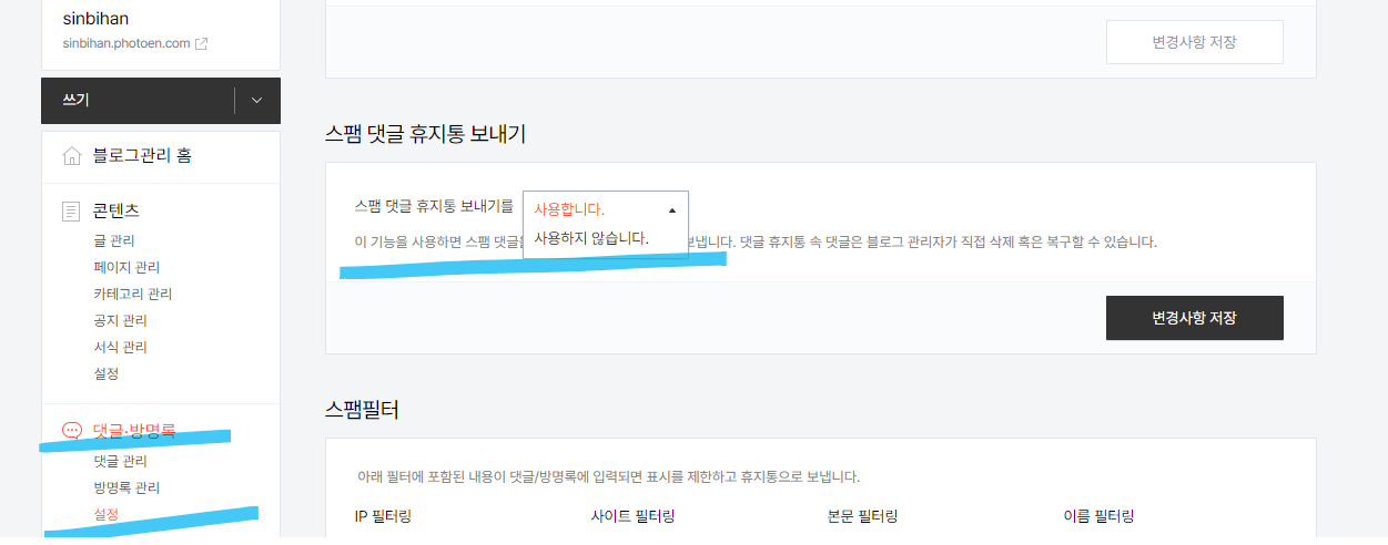 제 블로그를 들어가 봤습니다. 댓글 방명록-설정 스팸댓글 휴지통 보내기 기능이 사용합니다로 되어있습니다. 이곳에서 사용합니다, 사용하지 않습니다. 선택이 가능하지만 반복된 스팸글이 지속되면 티스토리에서 로그인 제 한 등 규제를 준다고 합니다. 댓글을 쓸 때도 주의해야 할 듯합니다.