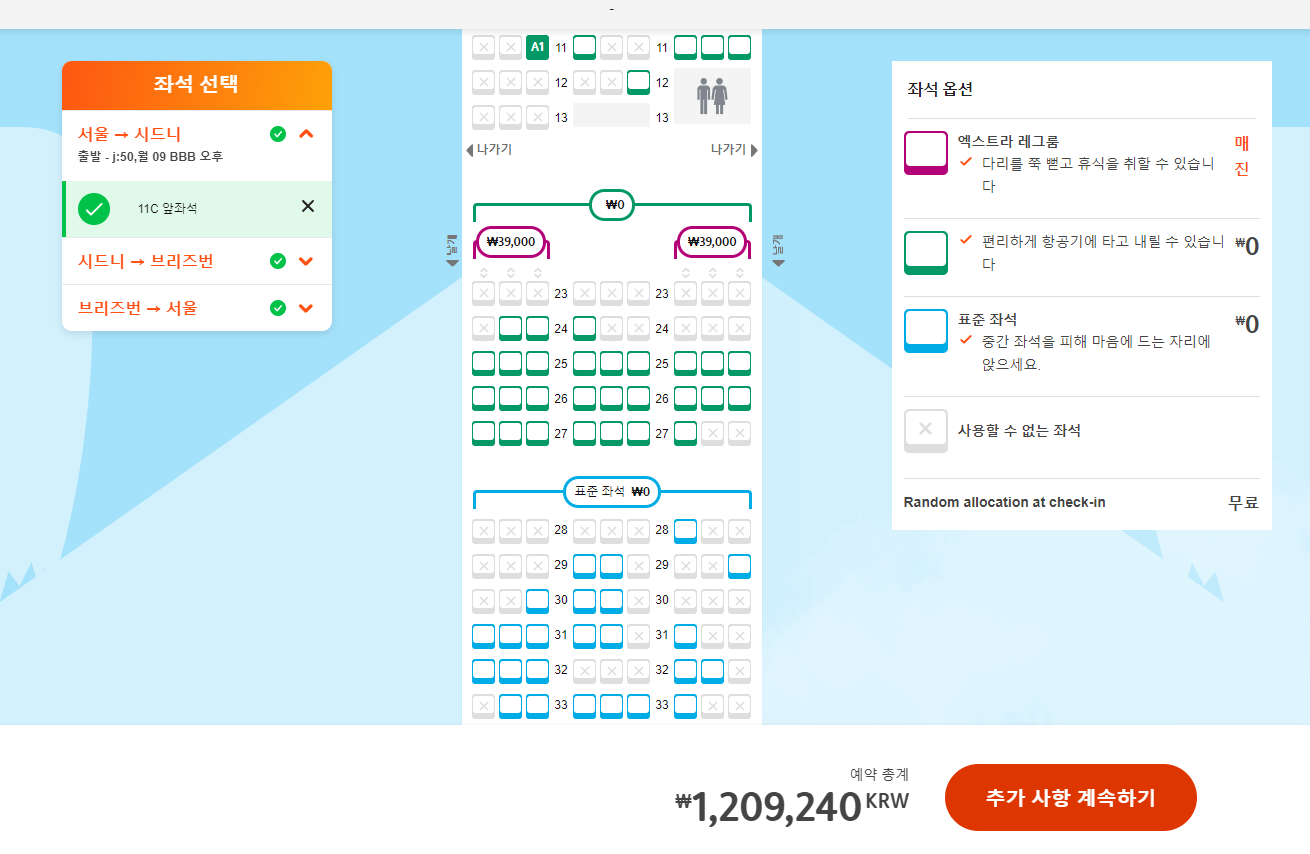 이제 좌석을 선택합니다. 저가 항공편이라서 좌석 간격이 좀 좁은편입니다. 최대한 맨 앞쪽이나 몇만 원 더 주고 업그레이드하는 것을 추천드립니다.