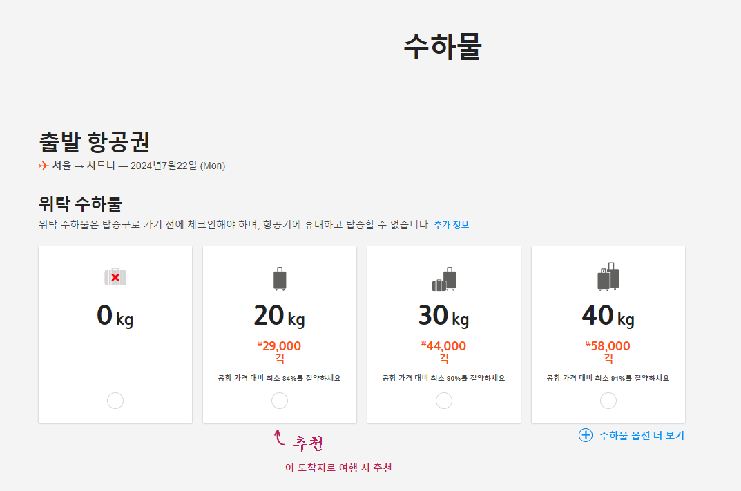 날짜를 예약하셨다면 수화물 무게를 선택합니다. 6박 8일을 다녀왔는데 무게는 20kg정도면 적당 한듯합니다.
