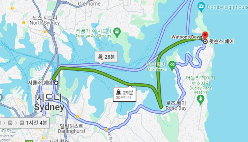 오늘 이동 경로입니다. 서큘러 퀘이에서 배를 타고 왓슨스베이까지 이동합니다. 왓슨스베이에서 점심을 먹은 후 버스를 타고 본다이비치로 이동합니다. 왓슨스베이도 방문하고 본다이비치까지 오늘 하루 일정입니다.