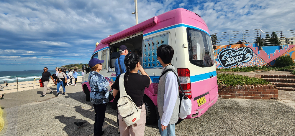 해변가에 있는 아이스크림 차에서 아이스크림도 1개씩 먹어봅니다. 호주 동전이 궁금했던 아이들을 위해 이곳에서는 현금결제를 해봅니다.