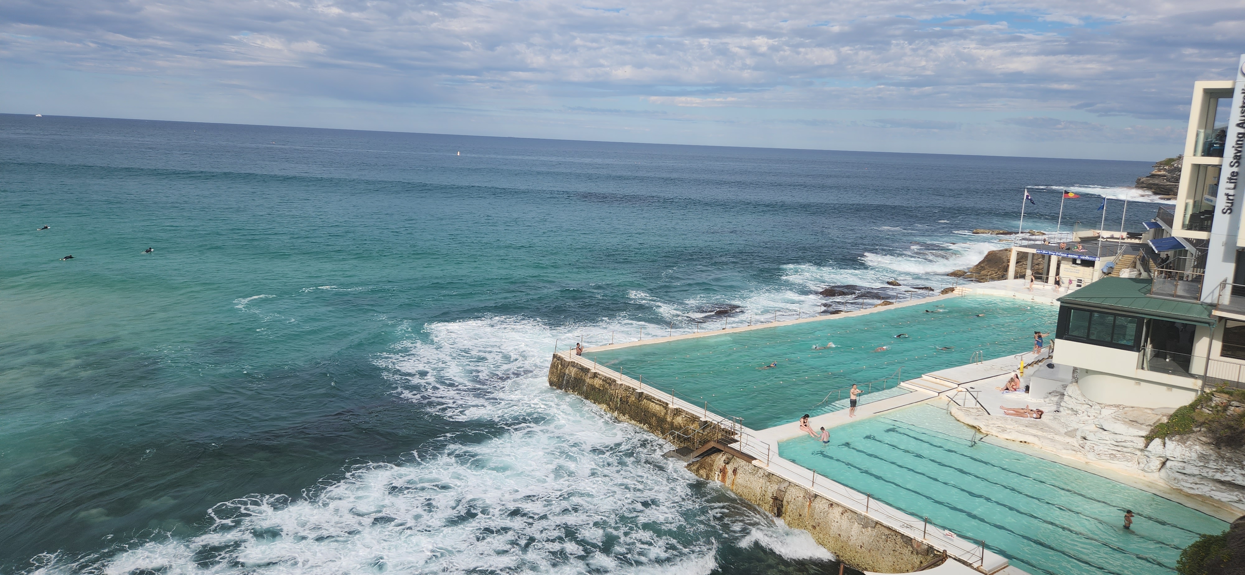 바로 옆에 있는 아이스버그 수영장입니다. 이곳에서도 많은 사람들이 수영을 즐기고 있습니다. 다음에 방문할 때는 수영복을 꼭 챙겨 오자고 말해보는 시간이었습니다. 아이스버그(icebergs)는 본다이비치에서 계속 파도가 쳐서 바닷물이 수영장 물에 들어옵니다. 색다른 느낌으로 수영하실 수 있는 수영장입니다.