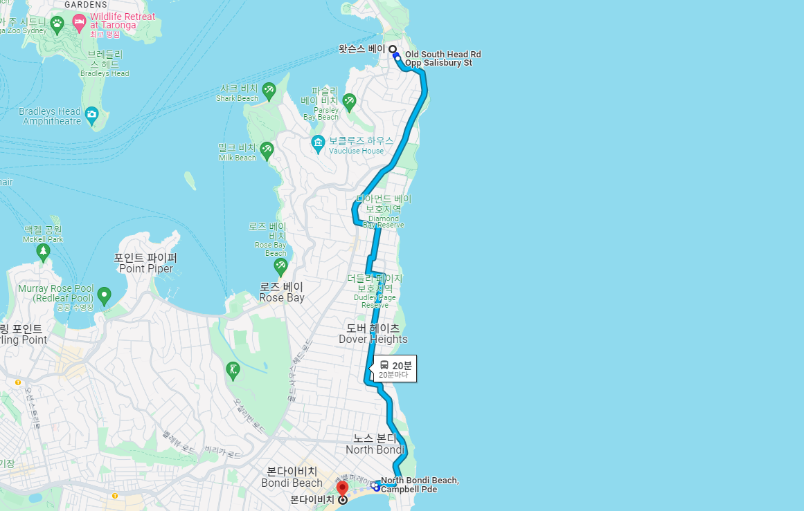 시드니에서 페리를 타고 왓슨스 베이에서 버스를 타고 본다이 비치를 방문했습니다. 본다이비치 가는 방법은 여러 가지이지만 주차가 쉽지 않다는 말을 들어서 대중교통을 이용해서 방문했습니다. 방문하기 위해 지나는 길마다 모두 유명한 관광지들이어서 눈이 즐거운 하루입니다.
