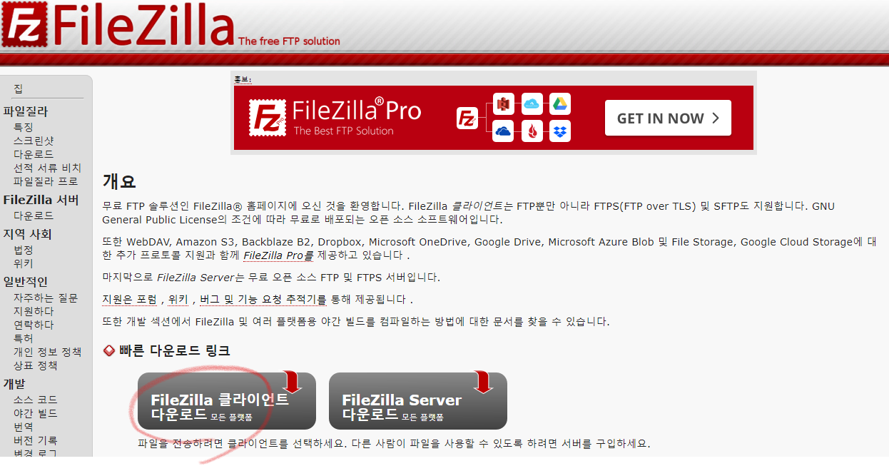FileZilla 클라이언트 다운로드 클릭해주세요