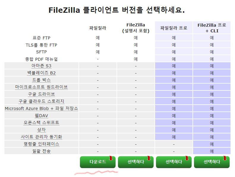 클라이언트 버전을 선택하세요 맨 처음 파일질라로 선택했어요 무료로 단순 파일 전송만 할 거라면 상관없습니다.