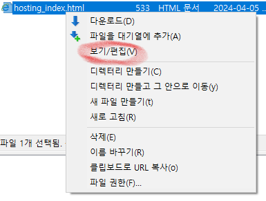 편집할 index.html 오른쪽 마우스로 클릭후 보기 편집을 선택하시면 선택한 편집기로 연결됩니다.